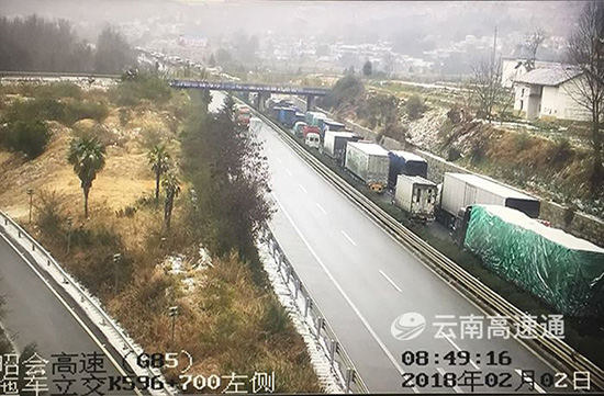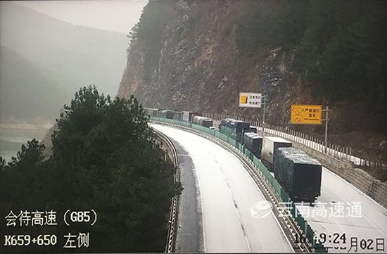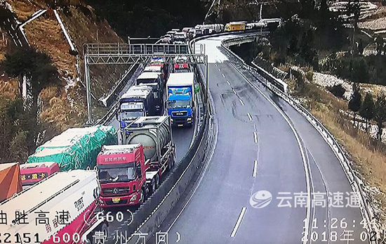 ????2日清晨,昭會(huì)高速上、下行K717+850—K596+700路段(卡竹、迤車站間),因路面結(jié)冰不具備通行條件,導(dǎo)致此路段上、下行交通中斷,上行車輛在迤車立交截留;下行車輛在卡竹立交截留。