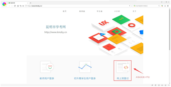 ????登錄網(wǎng)上預(yù)登記網(wǎng)址:昆明市學(xué)考網(wǎng)(http://www.kmzky.cn),如下圖所示點(diǎn)擊“網(wǎng)上預(yù)登記 ”進(jìn)入預(yù)登記平臺(tái)。