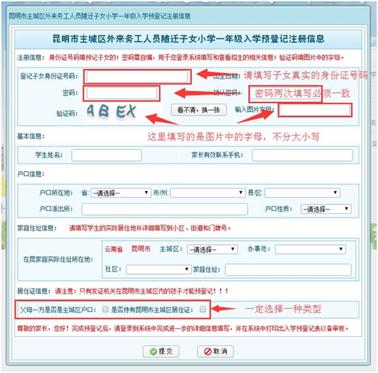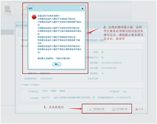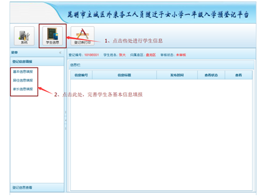 ????賬號(hào)信息注冊(cè);登錄系統(tǒng),分別進(jìn)入“基本信息填報(bào)”“居住信息填報(bào)”“家長(zhǎng)信息填報(bào)”三個(gè)界面,依次對(duì)信息進(jìn)行完善。如信息填寫(xiě)無(wú)誤,系統(tǒng)將生成《昆明市主城區(qū)外來(lái)務(wù)工人員隨遷子女小學(xué)一年級(jí)入學(xué)預(yù)登記表》。預(yù)登記表可下載后進(jìn)行打印,也可在網(wǎng)頁(yè)中直接打印,學(xué)生家長(zhǎng)可根據(jù)實(shí)際情況自行選擇。