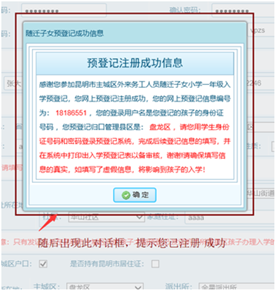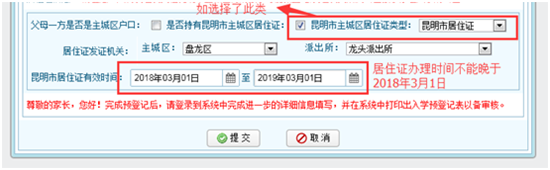 ??? 至此,參加網(wǎng)上預(yù)登記的學(xué)生及家長(zhǎng),就順利完成了昆明市主城區(qū)2018年外來(lái)務(wù)工人員隨遷子女網(wǎng)上預(yù)登記的全部環(huán)節(jié),請(qǐng)學(xué)生家長(zhǎng)保存好已打印的《昆明市主城區(qū)外來(lái)務(wù)工人員隨遷子女小學(xué)一年級(jí)入學(xué)預(yù)登記表》,于2018年8月1日—5日,攜帶相關(guān)材料前往各區(qū)公布的確認(rèn)點(diǎn)進(jìn)行現(xiàn)場(chǎng)確認(rèn)。