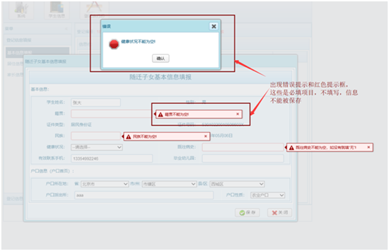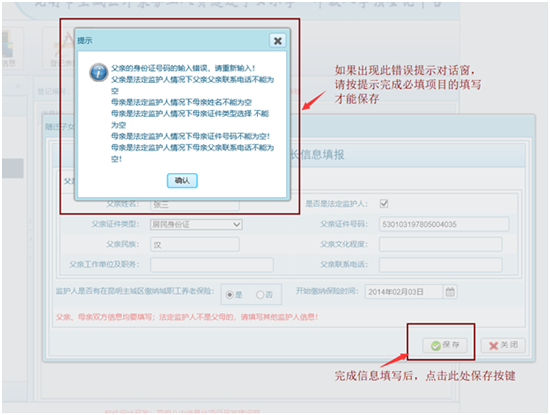 ????信息填寫(xiě)完成后,點(diǎn)擊保存按鍵;信息保存成功后,可點(diǎn)擊關(guān)閉按鍵關(guān)閉此頁(yè)面。 注意:請(qǐng)根據(jù)界面欄目進(jìn)行填寫(xiě),如出現(xiàn)以下提示,可根據(jù)系統(tǒng)提示對(duì)相應(yīng)的欄目進(jìn)行修改后,方可保存。?