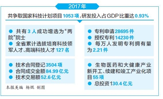 不斷夯實科技創(chuàng)新基礎(chǔ),大眾創(chuàng)業(yè)萬眾創(chuàng)新取得新進展。2017年,我省共有3人成功增選為“兩院”院士,全省累計選拔培育科技領(lǐng)軍人才、高端科技人才127名;新增省級創(chuàng)新團隊28個,累計206個;新建院士專家工作站109個,累計348個;新認定高新科技企業(yè)145戶,總數(shù)達1239戶,居西部?。ㄊ?、區(qū))第四位。統(tǒng)計數(shù)據(jù)顯示,2017年全省技術(shù)合同登記3504項,合同成交金額84.99億元,技術(shù)交易額52.6億元。全省專利申請28695件,授權(quán)專利14230件,每萬人發(fā)明專利擁有量為2.21件。