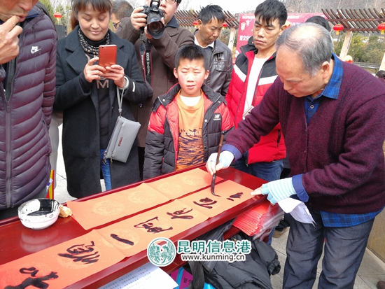 ????昆明信息港訊 通訊員陳敏 妙筆生花送祥瑞,翰墨留香迎新春。為深入貫徹落實(shí)習(xí)近平新時(shí)代中國(guó)特色社會(huì)主義思想和黨的十九大精神,營(yíng)造健康祥和、積極向上的文化氛圍和節(jié)日氣氛,在新春佳節(jié)即將到來(lái)之際,晉寧文聯(lián)組織書法家深入安江村、普達(dá)村、二街鎮(zhèn)、鄭和文化廣場(chǎng)等地方開(kāi)展送萬(wàn)福、進(jìn)萬(wàn)家,下基層、寫春聯(lián)、贈(zèng)送書籍公益活動(dòng)。共書寫春聯(lián)4000余副、贈(zèng)送《百蝶圖》《晉寧民間故事集》《月山》等文化書籍和期刊1000余冊(cè)。