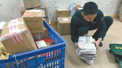 羅金城整理將投遞的報(bào)刊、包裹。記者 賀林平攝