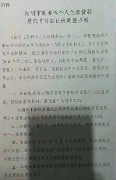????網(wǎng)傳《昆明市商業(yè)性個人住房貸款最低首付款比例調(diào)整方案的通知》原文: