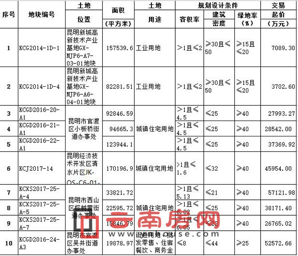 ????本月還有官渡區(qū)、經(jīng)開區(qū)出讓城鎮(zhèn)住宅類用地。官渡區(qū)出讓的3宗土地位于小板橋街道昌宏路,土地面積467畝,土地編號(hào)分別為KCGD2016-20-A1、KCGD2016-21-A1、KCGD2016-22-A1。交易文件顯示,該批土地為官渡文化生態(tài)新城項(xiàng)目的回遷安置地塊。經(jīng)開區(qū)出讓地塊編號(hào)為KCJ2017-14,出讓面積255畝,土地以網(wǎng)拍形式進(jìn)行交易。該地位于經(jīng)開區(qū)清水片區(qū),容積率>1且≤1.6,以土地起價(jià)45954萬(wàn)元計(jì)算,土地單價(jià)180萬(wàn)元/畝,樓面價(jià)1687元/平米。