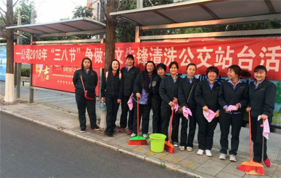 ????昆明信息港訊 記者李金梓 通訊員俞燕輝 今年是第108個“三八”國際婦女節(jié),也是第55個“學(xué)雷鋒”紀(jì)念日。為了弘揚雷鋒精神的同時,讓女職工度過一個具有特別意義的節(jié)日,3月5日—7日期間,昆明公交一公司積極組織公司女職工開展“爭做創(chuàng)文先鋒 清洗公交站臺”活動。