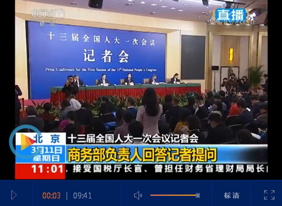 ????十三屆全國(guó)人大一次會(huì)議新聞中心11日舉行記者會(huì),商務(wù)部部長(zhǎng)鐘山、副部長(zhǎng)兼國(guó)際貿(mào)易談判副代表王受文、副部長(zhǎng)錢克明就“推動(dòng)形成全面開(kāi)放新格局 推動(dòng)商務(wù)事業(yè)高質(zhì)量發(fā)展”相關(guān)問(wèn)題回答中外記者提問(wèn)。