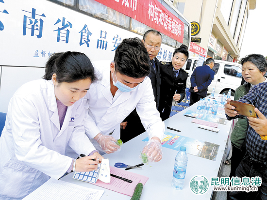 ????昆明信息港訊(昆明日?qǐng)?bào) 記者徐婕) 為不斷提高群眾對(duì)昆明市食品安全的滿意度以及市民對(duì)創(chuàng)建國家食品安全示范城市工作的參與度和獲得感,充分發(fā)揮社會(huì)公眾的參與和監(jiān)督作用,昨日,3·15食品安全“你點(diǎn)我檢”活動(dòng)在云紡舉辦。市民拿著蔬菜、水果前來免費(fèi)檢測(cè),現(xiàn)場(chǎng)就能得知蔬果是否有農(nóng)藥殘留。