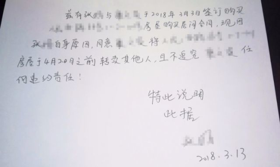 ????3月13日,張女士按照中介擬定的格式、內(nèi)容抄寫(xiě)了一份說(shuō)明:“因張女士原因,同意房東將人民西路的房屋于4月20日前轉(zhuǎn)賣(mài)他人,且不追究房東的任何違約責(zé)任。”這份說(shuō)明房東未簽字,中介告訴張女士,要從押金里扣除3000元違約金。但張女士認(rèn)為,并非她不想購(gòu)買(mǎi)房子,而是房東不遷戶造成無(wú)法交易,所以根本不應(yīng)該扣這3000元。