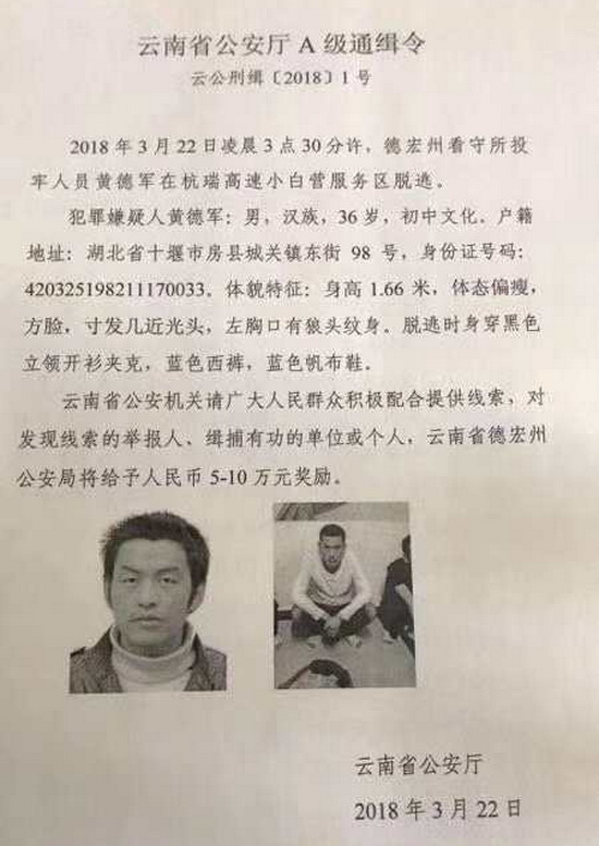 ????從德宏州看守所發(fā)布的協(xié)查通報來看,黃德軍是在杭瑞高速小白營服務(wù)區(qū)上廁所時從窗子逃脫。協(xié)查通報稱,2016年10月21日,黃德軍因涉嫌運(yùn)輸毒品被芒海邊境檢查站抓獲,曾關(guān)押于芒市看守所和德宏州看守所,其中一間監(jiān)室號為40號。今年3月9日,黃德軍被云南省高級人民法院核準(zhǔn)死刑,緩期兩年執(zhí)行。