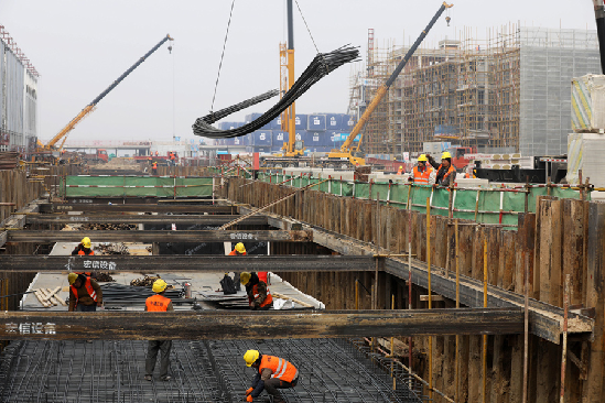 2018年2月19日,工人們?cè)谛郯彩忻穹?wù)中心項(xiàng)目現(xiàn)場(chǎng)施工。