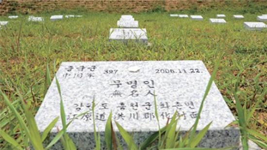????在韓國(guó)京畿道坡州市積城面沓谷里有一座墓地,距離朝韓軍事分界線僅有6.3千米,這里安放著數(shù)百具志愿軍烈士遺骸。墓碑上標(biāo)注著這些烈士遺骸挖掘的時(shí)間、地點(diǎn),但因年代久遠(yuǎn),志愿軍遺骸身份難以確定,只能用中文和韓語(yǔ)標(biāo)明“中國(guó)軍無名人”。