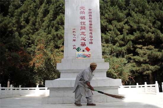 ????照片中的守墓人,名叫阿里?艾哈邁德。這位普通的巴基斯坦老人自1978年起自愿在這里守護(hù)陵墓,當(dāng)時(shí)年僅22歲。他說:“在公路的修筑過程中,我親眼看到中國(guó)人為巴基斯坦的發(fā)展進(jìn)步晝夜勞作,為我們犧牲,他們讓我非常感動(dòng)、很受鼓舞。只要我活一天,我在這里的工作就不會(huì)停歇?!?/p>