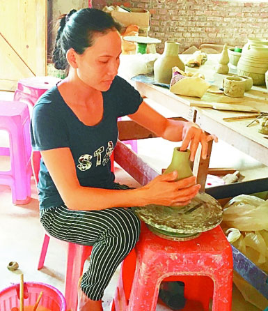 ????改革開放以來,條件好了,大家都去種橡膠、種甘蔗、種木薯。沒有多少人做陶了。羊拜亮就無償制作陶器送給周邊黎民釀酒、泡藥、煮飯、腌制食品,以免讓陶器在黎民生活中消失。黃玉英從小跟隨母親學習黎族原始制陶技藝及黎族紡染織繡技藝,成了當?shù)匦∮忻麣獾呐嚾?,并積極招收學徒,傳承民間手工藝。文阿芬、黃翠美也慢慢接上了上一代的班。