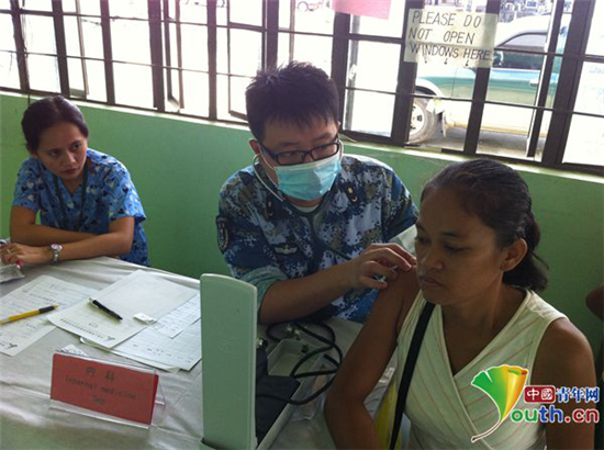 2014年11月,邱峰在菲律賓塔克洛班市災(zāi)區(qū)救治當(dāng)?shù)孛癖?。本人供圖
