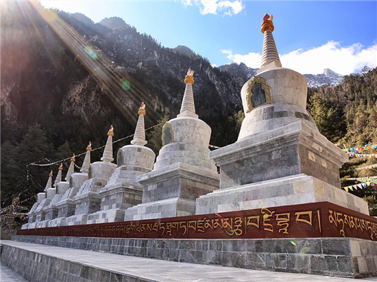 香巴拉佛塔是一座天然佛塔,位于海拔4200多米的雪域,天然形成的金字塔形山峰身披白雪,猶如九天直下,巍峨聳立。一側(cè)的另兩座雪山,一形似端坐誦經(jīng)的喇嘛,一似展開的經(jīng)書。此佛塔、經(jīng)書、老喇嘛三座高山被人們形象的譽為“佛、法、僧”三寶,每年都有大量虔誠的信徒前來轉(zhuǎn)山、覲拜。