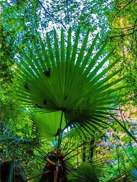 峽谷里長有許多棕櫚樹,高的可達十米左右,有的形如一盞路燈,孤丁而立;有的貼壁而生,形如父子;有的相依相偎,如同情侶。在懸崖峭壁上還可看到一片面積5畝左右的山棕櫚林,直立挺拔,扇葉翠綠,青藤纏繞,感覺就像進入熱帶雨林。