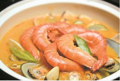 在東莞某國際大酒店,掌勺主廚將新鮮九節(jié)蝦去掉蝦腸洗凈,土豆切丁入油鍋香炸備用。熱鍋中放蔥蒜粒、洋蔥片和青紅椒片炒香,加入適量用雞肉與排骨熬就的高湯,倒入咖喱粉煮滾。依序滑入白貝、青口和九節(jié)蝦水燜煮去腥,待九成熟時分別撈起,以盡量保持海鮮的鮮嫩度。砂鍋底部平鋪一層炸好的土豆,分層碼上貝類、青口等海鮮,再淋透上熬好的香濃咖喱汁,海鮮鍋即大功告成。入口酸酸辣辣十分刺激開胃,輕而易舉激活味蕾。
