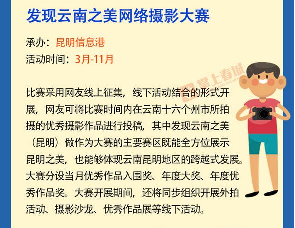 本屆網(wǎng)絡(luò)文化節(jié)由云南省委網(wǎng)信辦、省委高校工委、省總工會、團(tuán)省委、省婦聯(lián)、昆明市委網(wǎng)信辦指導(dǎo),昆明市網(wǎng)絡(luò)文化協(xié)會主辦,昆明市文明辦、市委統(tǒng)戰(zhàn)部、市教育局、市總工會、團(tuán)市委、市婦聯(lián)、市文聯(lián)協(xié)辦,云南省級主要新聞網(wǎng)站和昆明市屬網(wǎng)站等新媒體單位承辦。(部分圖片來自掌上春城)