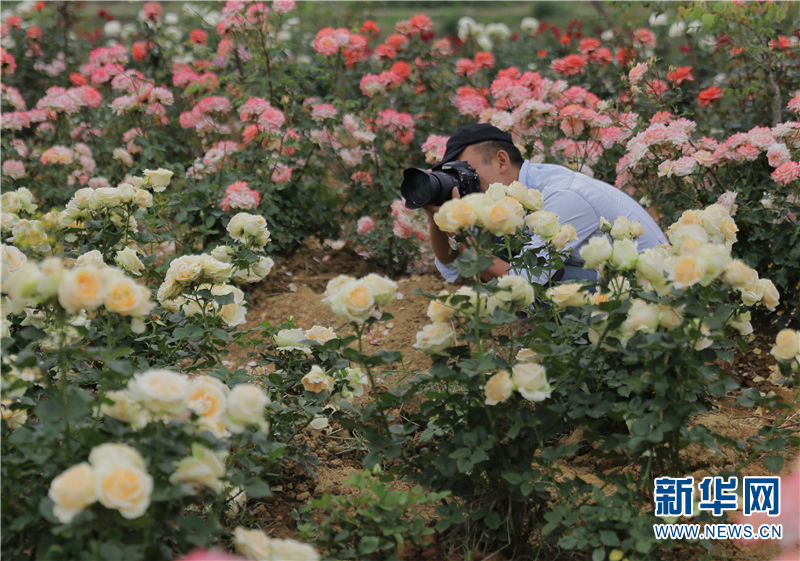 圖為一名游客在玫瑰莊園內(nèi)拍攝玫瑰花。