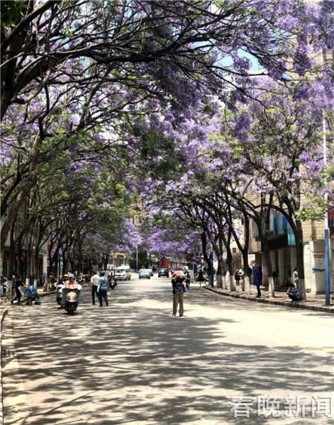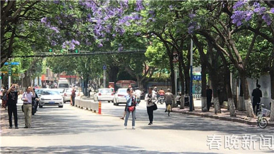 昆明教場(chǎng)中路上的藍(lán)花楹已進(jìn)入了盛花期,街上彌漫著淡淡的清香,浪漫的紫色更是美不勝收。隨著美圖刷爆朋友圈,這里也成為了名副其實(shí)的“網(wǎng)紅路”。