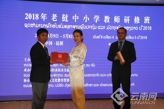 5月8日,2018年老撾中小學(xué)教師研修班結(jié)業(yè)典禮在昆明舉行。典禮現(xiàn)場(chǎng),到場(chǎng)嘉賓與研修班教師一同觀看了本次研修班紀(jì)念短片。老撾人民民主共和國(guó)駐昆明總領(lǐng)事館坎蓬?馮桑迪總領(lǐng)事、云南省商務(wù)廳巡視員黃姍為研修班教師頒發(fā)了結(jié)業(yè)證書。