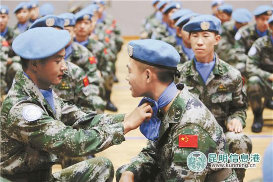 昆明信息港訊(昆明日報 記者李丹丹 通訊員楊雙權(quán) 攝)日前,陸軍第75集團軍某旅大禮堂口號震天、氣勢如虹,中國第17批赴黎巴嫩維和部隊成立暨出征大會在這里隆重舉行。維和分隊官兵頭戴藍色貝雷帽、佩戴“UN”臂章,莊嚴宣誓。官兵們莊嚴肅穆、義無反顧的表情,表達了忠實履行使命、維護世界和平的堅定決心。
