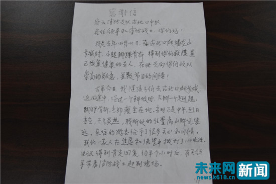 一年前,一位河北老人隨子女爬古北口長城不慎摔傷。幸虧得到消防隊員的救援,及時將其抬下山送往醫(yī)院治療。時隔一年老人康復(fù),近日親筆手寫感謝信,字里行間充滿了對消防員的真誠感激和無盡謝意。