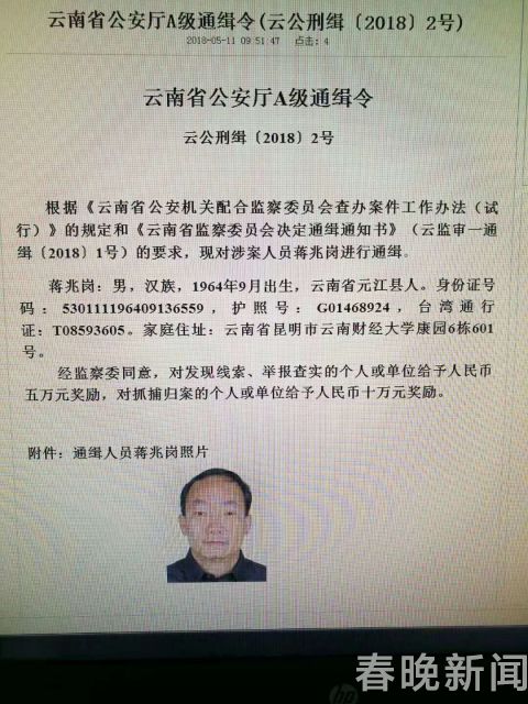 2018年5月11日,云南省公安廳發(fā)布A級通緝令,西南林業(yè)大學(xué)黨委副書記、校長蔣兆崗潛逃被通緝。