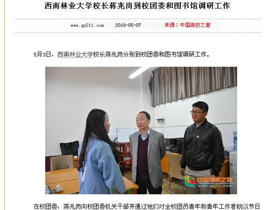 中國高校之窗的一則新聞顯示,今年5月3日,蔣兆崗還以校長身份,分別到西南林業(yè)大學(xué)校團委和圖書館調(diào)研工作。在校團委,蔣兆崗向團委機關(guān)干部并通過他們對全校團員青年和青年工作者致以節(jié)日的問候,他還和五大學(xué)生組織值班同學(xué)交談,了解同學(xué)們的學(xué)習(xí)、生活、工作及活動開展情況,勉勵他們信念執(zhí)著,立鴻鵠志,做奮斗者,頑強拼搏。