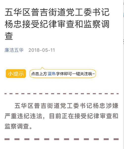 昆明信息港訊 5月11日,記者從昆明市五華區(qū)紀委微信公眾號獲悉,五華區(qū)普吉街道黨工委書記楊忠涉嫌嚴重違紀違法,目前正在接受紀律審查和監(jiān)察調(diào)查。