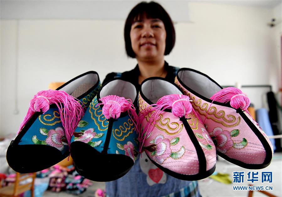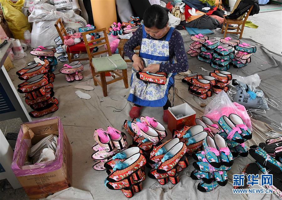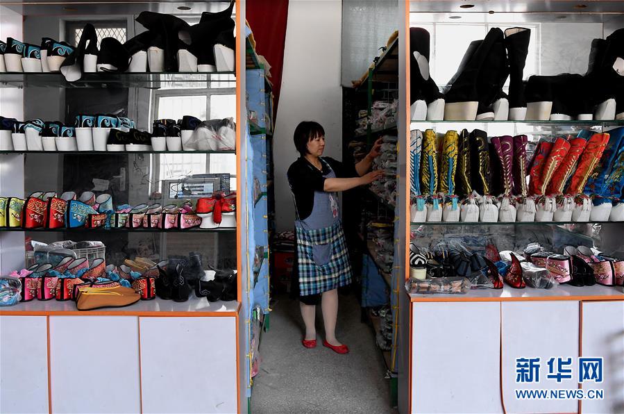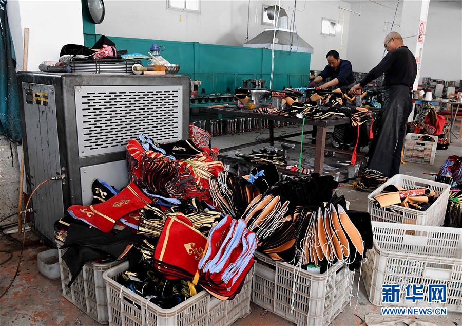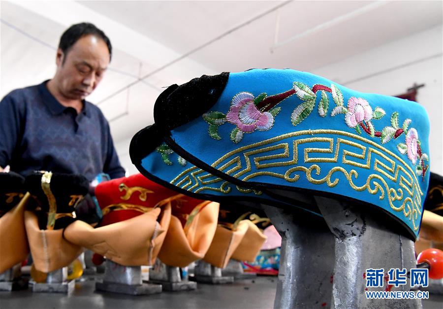 5月9日,霍莊村村民在車間內(nèi)制作戲鞋