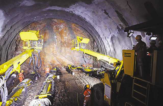 據(jù)介紹,在隧道斷面內(nèi),洞內(nèi)可同時容納兩臺三臂鑿巖臺車施工,最快時一天可掘進(jìn)約9米。相比人工開挖作業(yè),既安全又高效。