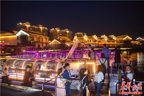 5月13日晚,“美麗中國長江行——共舞長江經(jīng)濟(jì)帶·生態(tài)篇”湖南站媒體團(tuán)登船夜游穿紫河。唐俊 傅聰 攝