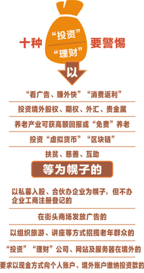 針對新型網(wǎng)絡(luò)傳銷、非法集資等突出經(jīng)濟犯罪案件高發(fā)多發(fā)、社會關(guān)注度高的情況,省公安廳提醒廣大群眾,要切實增強風(fēng)險意識,警惕以“看廣告、賺外快”“消費返利”等為幌子的;以投資境外股權(quán)、期權(quán)、外匯、貴金屬等為幌子的;以養(yǎng)老產(chǎn)業(yè)可獲高額回報或“免費”養(yǎng)老為幌子的;以私募入股、合伙辦企業(yè)為幌子,但不辦企業(yè)工商注冊登記的;以投資“虛擬貨幣”“區(qū)塊鏈”等為幌子的;以扶貧、慈善、互助等為幌子的;在街頭商場發(fā)放廣告的;以組織旅游、講座等方式招攬老年群眾的;“投資”“理財”公司、網(wǎng)站及服務(wù)器在境外的;要求以現(xiàn)金方式向個人賬戶、境外賬戶繳納投資款的10種“投資”“理財”項目。