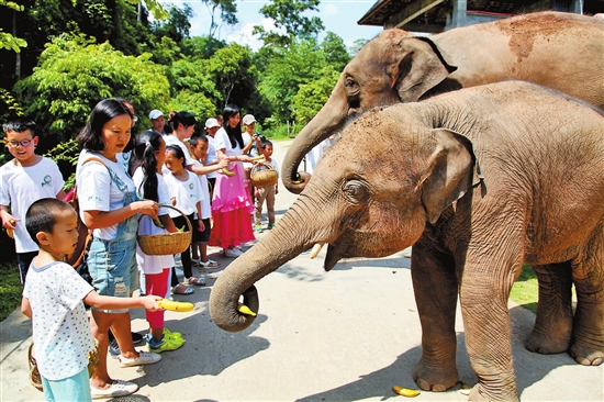 在亞洲象種源繁育中心,志愿者通過中心工作人員的講解,了解了中心內(nèi)每一頭獲救野生亞洲象的故事。他們還陪野生亞洲象進行上山野化訓練、為亞洲象洗澡、準備美食等,通過這種體驗式服務,喚起大家對保護生態(tài)環(huán)境和維護旅游環(huán)境的自覺意識。
