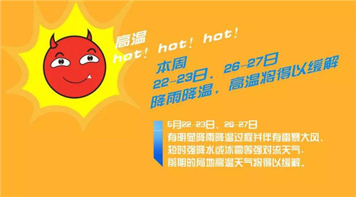 預(yù)計本周受冷空氣和暖濕氣流影響, 5月22-23日、26-27日有明顯降雨降溫過程并伴有雷暴大風、短時強降水或冰雹等強對流天氣,前期的局地高溫天氣將得以緩解。