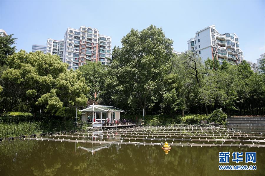 上海市長(zhǎng)寧區(qū)天山公園湖面一角鋪設(shè)了治污材料(4月25日攝)。