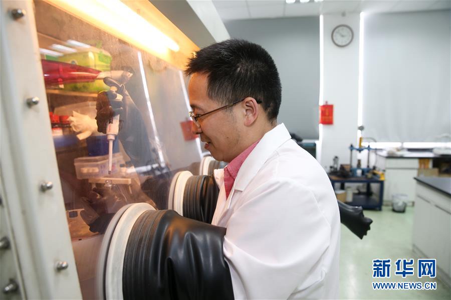 在中科院上海硅酸鹽研究所實(shí)驗(yàn)室內(nèi),黃富強(qiáng)研究員在進(jìn)行治污新材料的相關(guān)制備操作(4月24日攝)。