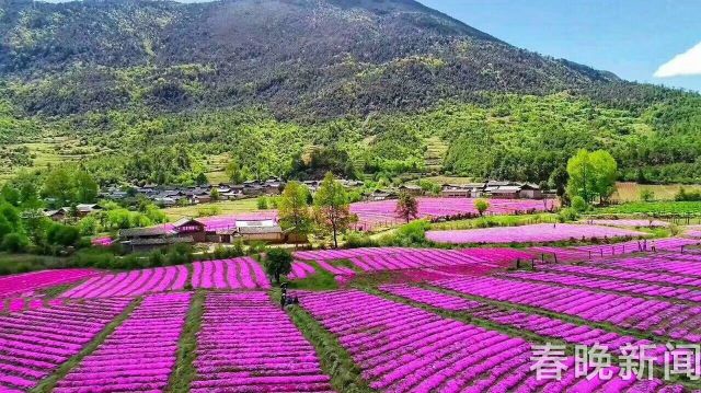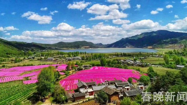 一團團紫紅的花朵種成垅、連成片,鋪滿緩坡、填滿房前屋后、親吻著土地,向湖邊延伸,映入眼簾、烙進心田。