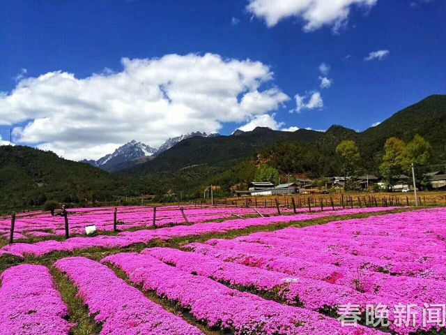 Moss phlox bloom brightly at the foot of Yulong Mountain in Lijiang