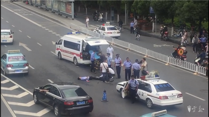 記者到達現(xiàn)場時,120急救人員已經(jīng)將兩名男子抬到車上送往醫(yī)院救治。目擊者胡先生介紹,23日11點40分左右他從這里經(jīng)過,“當時這兩個民警已躺在機動車道中間了,后來我從別人那里得知,派出所的民警在一旁的非機動車道上設卡檢查電動車,然后就有一個電動車沖卡,這兩個民警上前制止時被沖卡電動車撞倒了?!?/p>