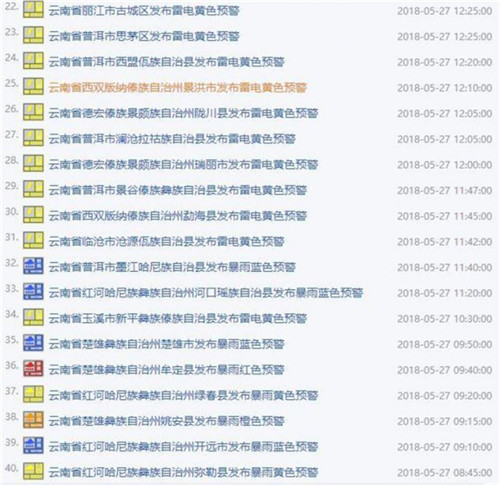 而上午,云南氣象臺發(fā)布了雷電和暴雨的70道預警,即便到下午4點,還有59道在預警中。