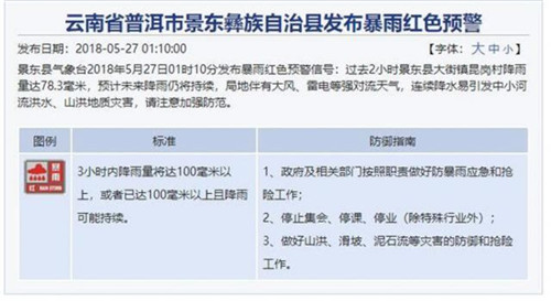 更讓人揪心的是,27日凌晨1:10分,和上午9:40分普洱景東縣和楚雄牟定縣都發(fā)出了暴雨紅色預警。