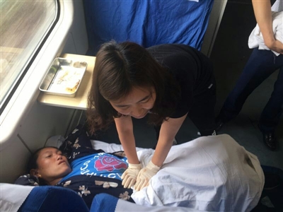 這時(shí),有著7年新生兒科工作經(jīng)驗(yàn)的護(hù)士董文靜聽(tīng)到廣播迅速趕來(lái),幫助這名孕婦接生。在董文靜等人的幫助下,這名孕婦順利產(chǎn)下一名女?huà)?。但是,由于孕婦產(chǎn)后胎盤不能順利娩出,加上列車上的醫(yī)療條件有限,孕婦依然有生命危險(xiǎn)。