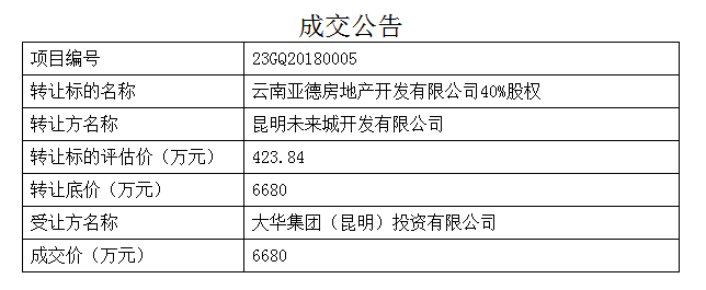 云南亞德房地產(chǎn)40%股權(quán)成交公示