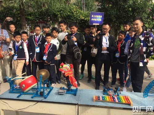 學(xué)生們圍觀舞獅機(jī)器人