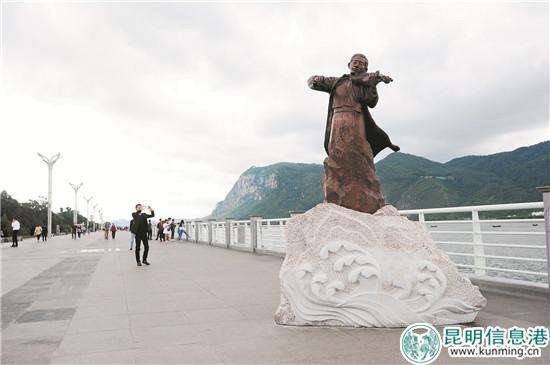 海埂大壩上新修建的雕塑。記者周密攝