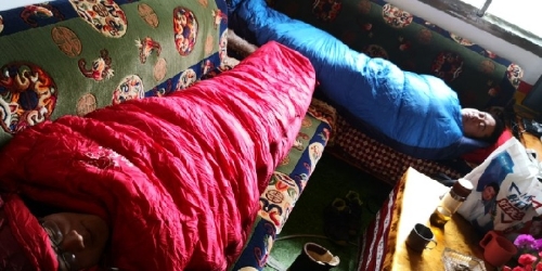 我每天是這樣睡覺的:身上穿一件羽絨服,腳上裹一件羽絨服,頭巾捂臉只露眼睛,頭戴毛線帽,再用一個塑料瓶灌上熱水放在腳邊,然后鉆進睡袋扮演蠶蛹。